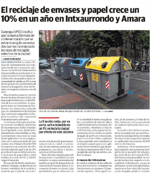 La nueva fórmula de contenerización que el pasado mes de julio se puso en marcha en los barrios de Amara Berri e Intxaurrondo para fomentar el reciclaje ha dado los frutos deseados. A finales del año pasado se había incrementado en un 10% la tasa de recogida de los contenedores de envases ligeros y papel de estos dos barrios respecto al mismo mes de 2017.