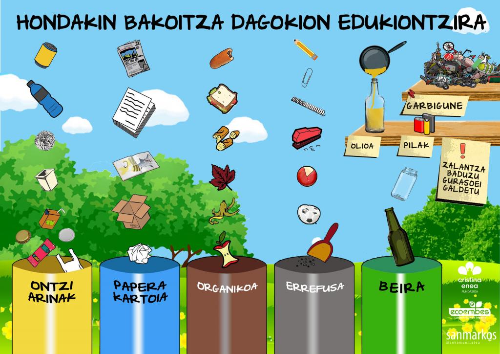 Con el objetivo de impulsar la recogida selectiva, el departamento de Educación de Cristina Enea ha decidido publicar un póster que sea válido para todas las edades (desde un niño de 2 años y hasta alguien de 99). En una imagen adaptada a residuos domésticos, tras su éxito en los colegios, cualquier miembro de la familia será capaz de reciclar bien los residuos.