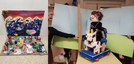 El aula de 6º de primaria del centro St. Patrick's English School nos cuenta que "Recycluty es una persona creada con un balón pinchado, una caja, una camiseta vieja, una mochila y unos cascos que ya no funcionaban. Sus ojos están hechos con tapones, lleva una mascarilla usada y lleva cinta de casete como pelo. Sus manos están hechos de guantes rellenados de curry y pasta para sopa, sus brazos son botellas. Las piernas son botellas de cola blanca y bolas de periódico. La vaca Marisonsoles esta hecha de cartón , sus ojos son una pelota de ping-pong cortada por la mitad y tapones en la nariz. Sus piernas son bricks de leche. Marisonsoles esta cubierta de papel de periódico y cola con agua. EL skate esta creado con dos cajas de VHS, dos posters y tapones. La parte de la lija (azul) esta hecha con tela vieja de una cortina". En este caso, se ha querido premiar la imaginación para construir una historia y la diversidad de materiales empleados.